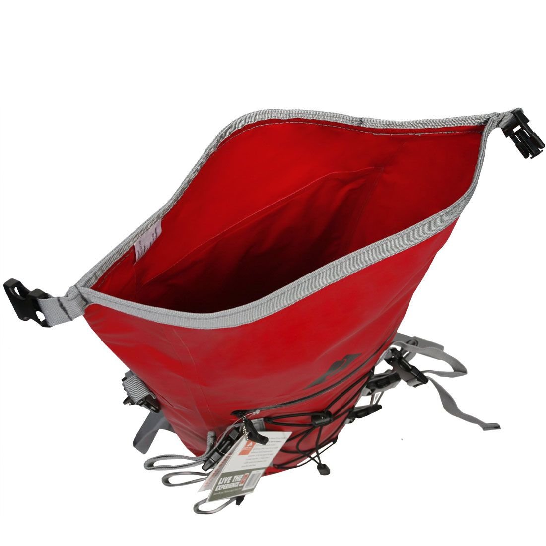 Διαθέτει σχέδιο Roll– Top, που σημαίνει ότι το διπλώνετε και το κλείνετε με πόρπη, ώστε να εμποδίσετε την εισροή νερού. Στα πλευρά του σακιδίου υπάρχουν 6 ιμάντες με πόρπες, οι οποίοι σας επιτρέπουν να δένετε την τσάντα με ασφάλεια, αλλά και να ορίζετε τον όγκο της. Αν ανοίξετε το κύριο τμήμα, δημιουργείται και μία βολική λαβή μεταφοράς.
